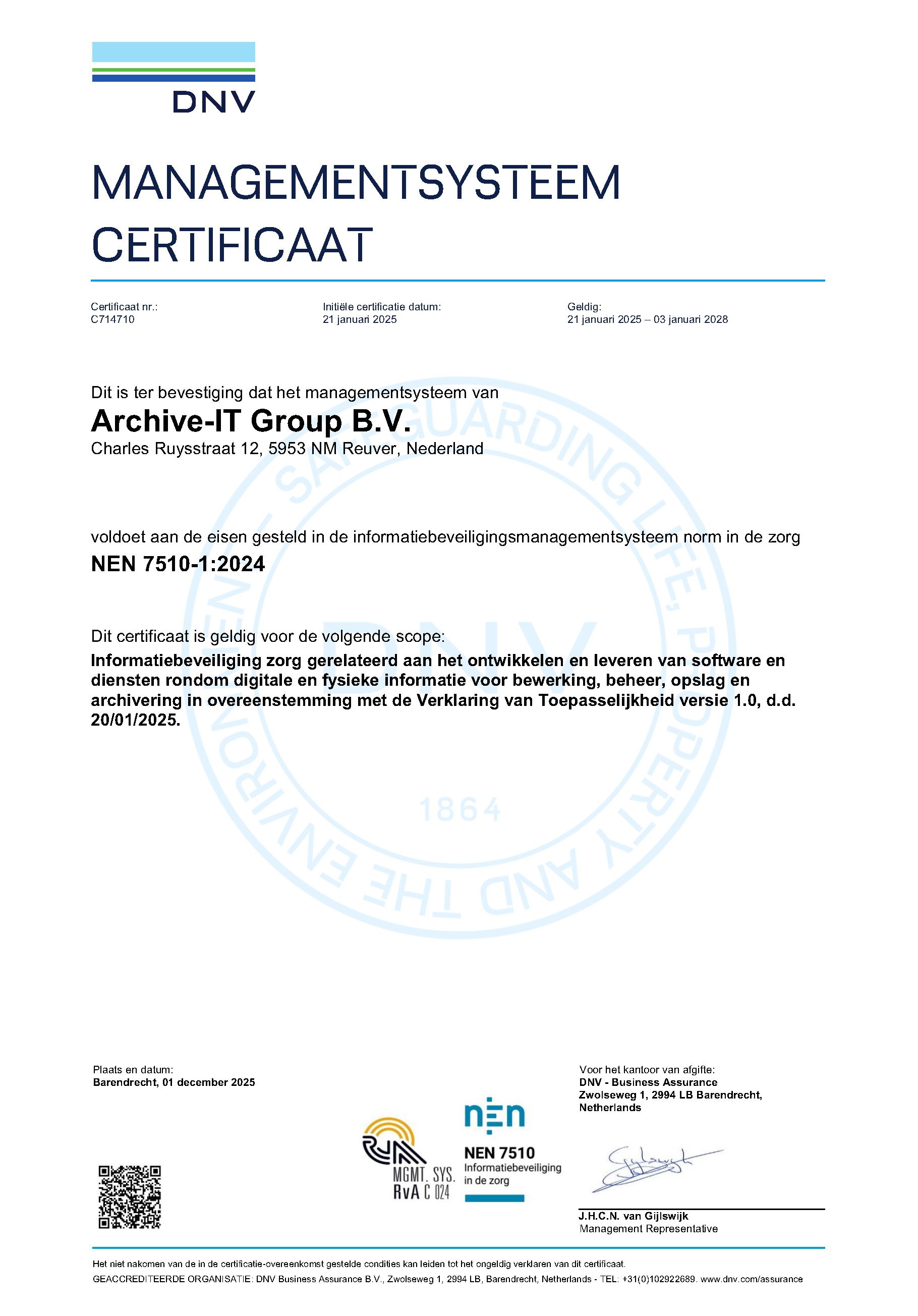 Dat Archive-IT haar processen rondom de beveiliging van zowel fysieke als digitale dossiers optimaal op orde heeft, blijkt onder andere uit de certificeringen die zijn afgegeven na onafhankelijke audits. De ISO-certificaten zijn uitgegroeid tot een onmisbaar aspect voor Archive-IT. Naast ISO 27001 bezit Archive-IT het NEN 7510 en ISO 9001 certificaat.