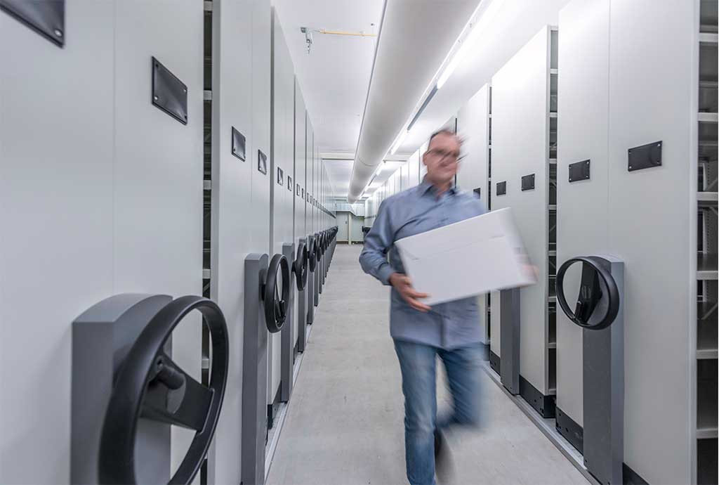 Het archief wordt in de geconditioneerde ruimte geplaatst. In de software wordt het archiefstuk gekoppeld aan een locatie, om het makkelijk terug te vinden.